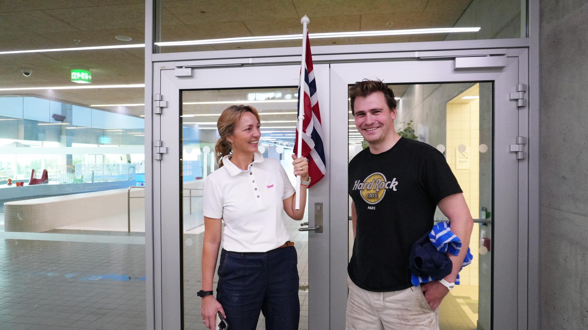 Daglig leder Siv-Hege Helsing Schrøen markerte gjenåpningen ved å ta i mot de første gjestene med flagg i resepsjonen.