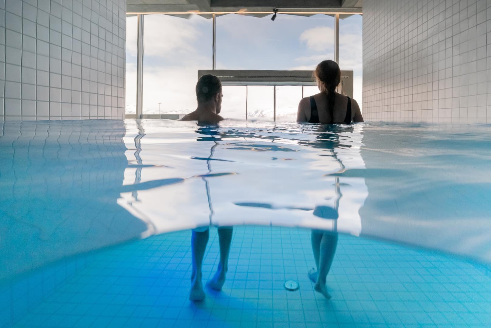 Midnattsol eller stiv kuling? Uansett er det deilig i utebassenget! Svøm gjennom kanalen og ut av bygget, og nyt en enestående utsikt mot de majestetiske fjellene på Kvaløya. Utebassenget er åpent hele året – uansett om det blåser stiv kuling eller midnattssola skinner. Dybde: 1,2 meter.