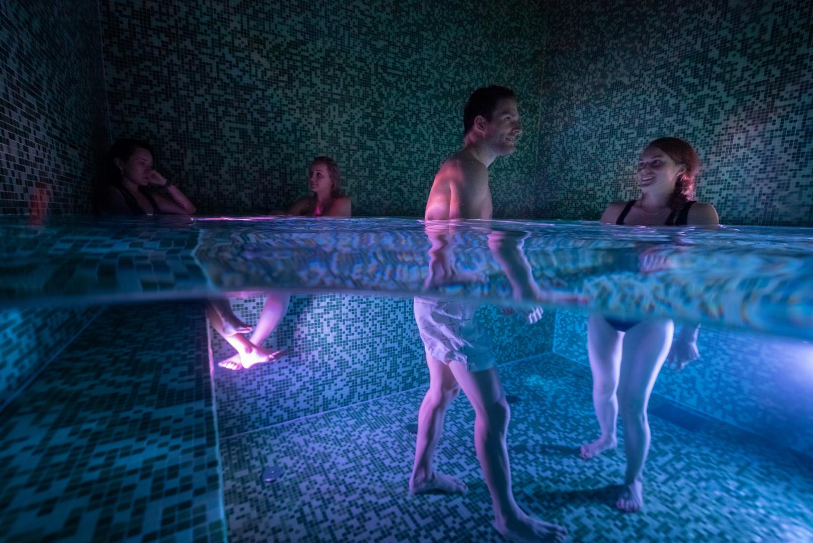 Kom ned i hetegrotta og nyt ro og velvære! Vannet i hetegrotta er 1,3 meter dypt, og holder deilige 38 grader. Grotta er utstyrt med undervannsbelysning som skaper en stemningsfull atmosfære. Hetegrotta befinner seg rett ved siden av badstuene. Vær oppmerksom på at det er 16-års aldersgrense for bruk av hetegrotta.