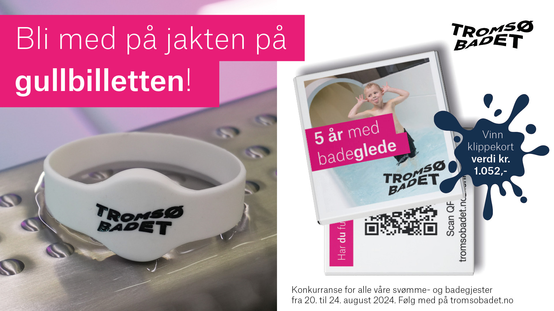Gullbillett nr. 8 er funnet – vi gratulerer! Vinneren gjorde seg til kjenne i resepsjonen under besøk på Tromsøbadet lørdag 24. august, men ved en feiltakelse ble ikke navnet notert. Kommer derfor tilbake med navn på denne vinneren innen kort tid. - GULLBILLETT NR. 9: